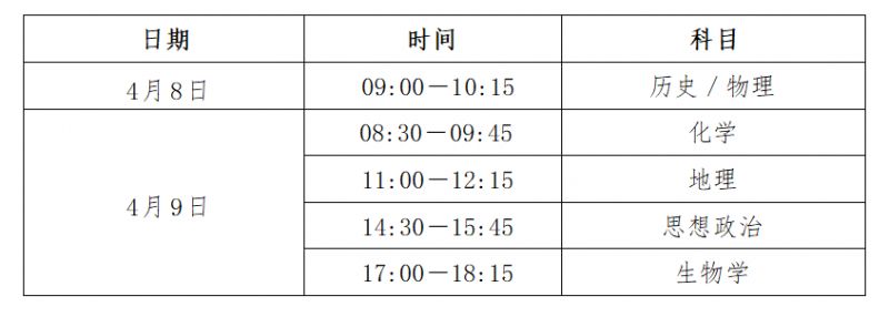 适应性测试考试科目为6门选择性考试科目,分别为:物理、历史2选1,思想政治、地理、化学、生物学4选2,考生根据高考报名时确定的选考科目参加相应测试。