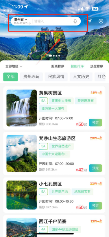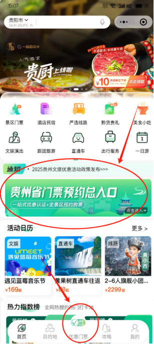 1. 进入“一码游贵州”微信小程序,在首页点击预约总入口按钮。