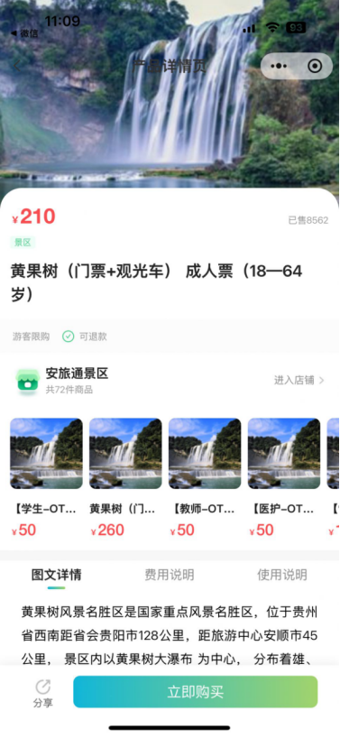 4.点击景区,就能看见该景区当前的开放情况、各类型门票(含增值服务)以及景区相关的周边配套等信息。