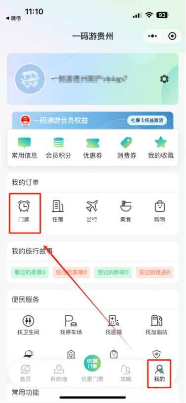 8.订单查询:回到一码游贵州小程序首页,点击底部“我的”-“我的订单”-“门票”,即可查看已购门票及核验二维码。